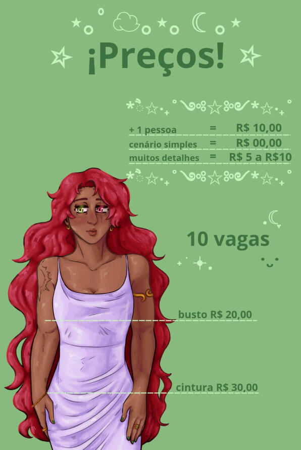+ 1 (one) person = R$ 10,00Simple background = $ 00,00Many details = $ 5 a $ 10,00__________________10 slots!