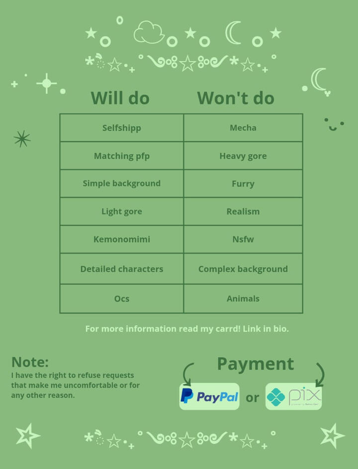 Paypal or Pix.For more information read my carrd! Link in bio.