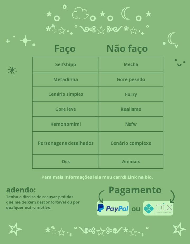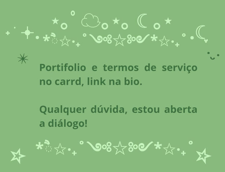 Portifólio e termos de serviço no carrd, link na bio.Qualquer dúvida, estou aberta a diálogo!